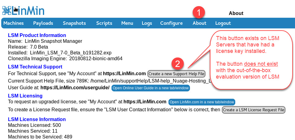 The example below shows the partial LSM About page after having installed a Lifetime license key for 500 Machines: