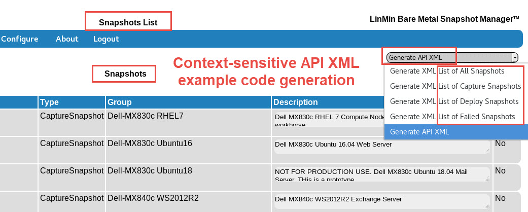 The LSM GUI pages includes drop-downs to generate API example code using the variables on the GUI page for rapid API implementations: