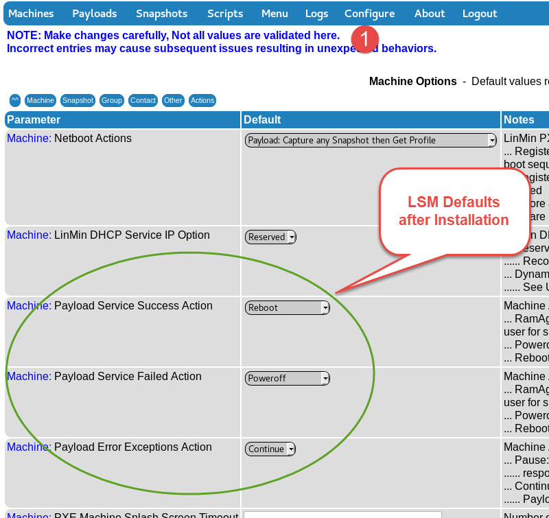 Refer to Configure (LSM Configuration Defaults) for the general Machine Actions After Payload Service.