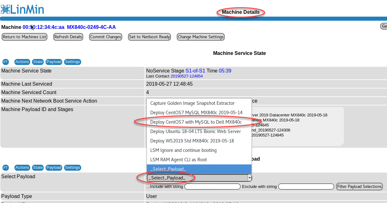 Example of the newly-created Payload assigned to a Machine set to the State "Netboot Ready":