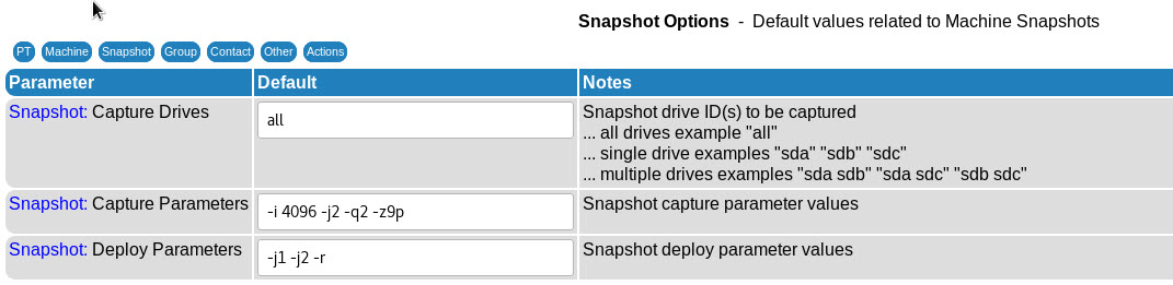 The Configure page has a section containing the default Clonezilla parameters that all Snapshots inherit unless modified by the User on a Snapshot by Snapshot basis:
