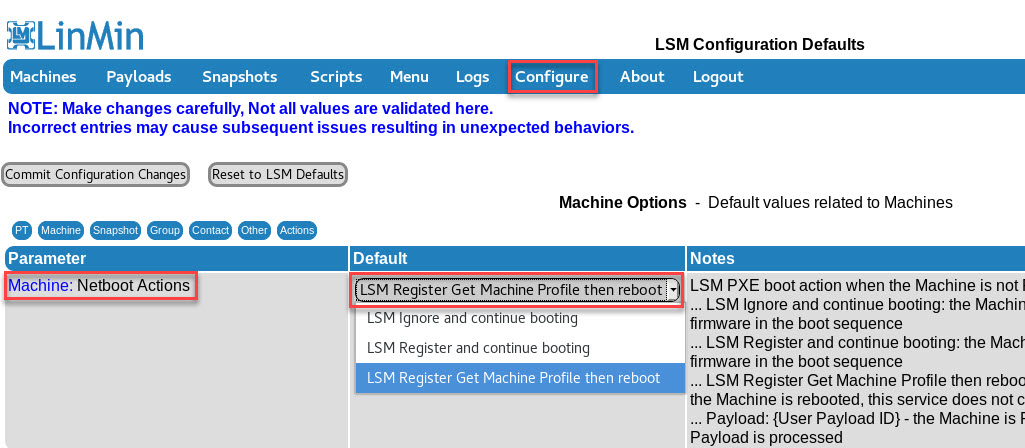 On the Configure page, ensure that Machine Netboot Actions is set to "LSM Register Get Machine Profile then reboot":