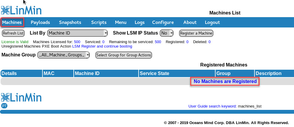 On the Machines page, note that the Machine you are about to PXE-boot is not already registered: