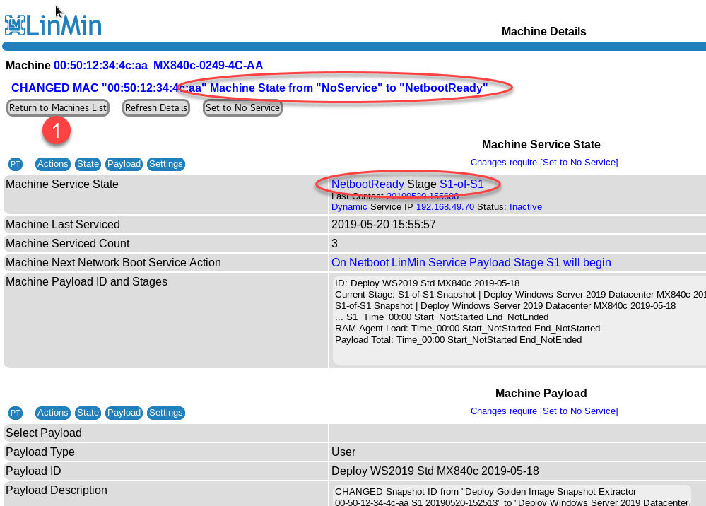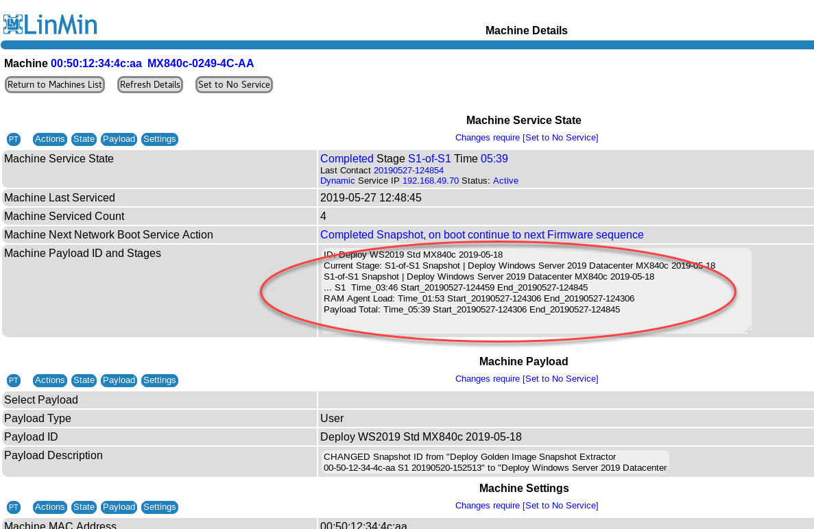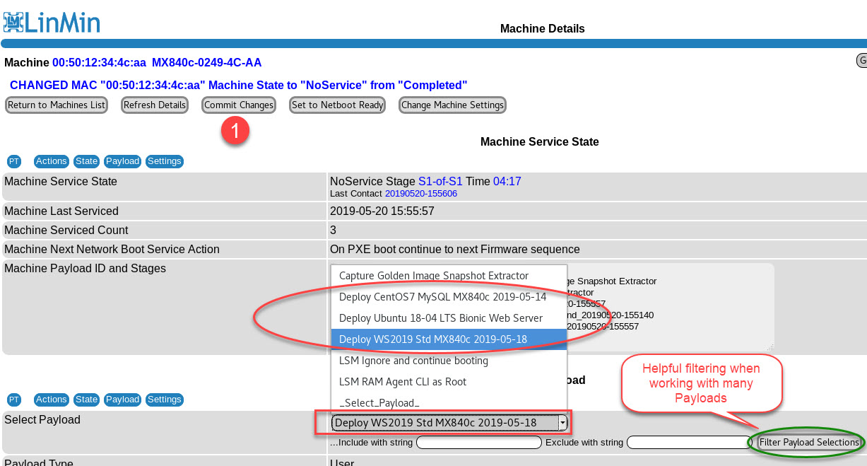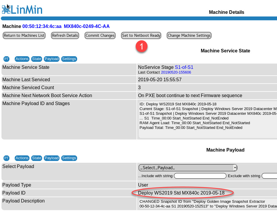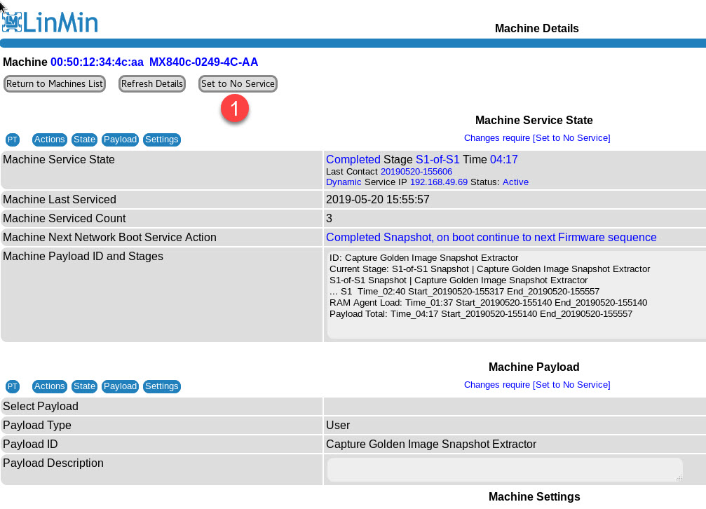 We will start by setting the Machine to "No Service" then proceed to assign the desired Payload and set the Machine to "Netboot Ready":